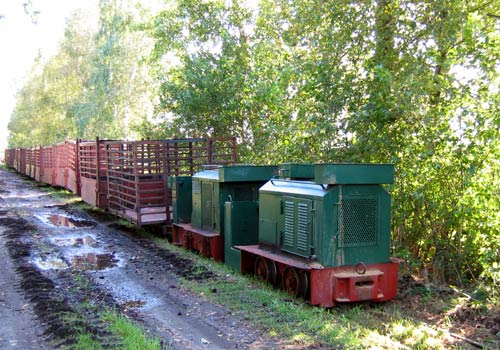 Torfwerk Sauensiek: Der Gesamtbestand vom Werk Hatzte auf dem Werkshof in Sauensiek, vorne in der Mitte die Diema FNr. 1196, dahinter rechts die Diema FNr. 2852 und links Schöma FNr. 2656. (Foto: 16.09.2005, Jens Merte)