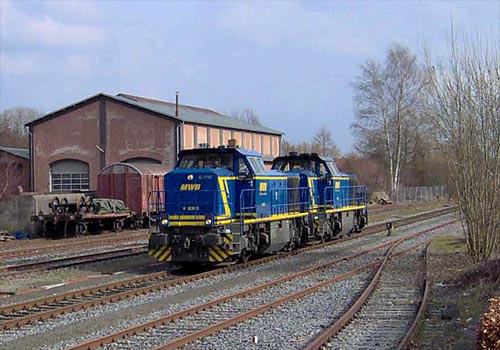 26.03.2006/ bd/ An Sonntagen ruht normalerweise auf die Bentheimer Eisenbahn der Zugverkehr. Nicht so am 26. März 2006, als die Mittelweserbahnloks V 2301 und V 2303 nach Coevorden-Heege unterwegs waren. Der Grund der Fahrt: beide Loks sind vom Mitsui Rail Capital Europe erworben worden, welche sie dann wieder an die Mittelweserbahn vermietet. Damit sie auch offiziell in den Bestandlisten der Niederländischen Firma geführt werden können, müssen sie einmal mit ihren Räder die Niederländischen Boden berührt haben.
