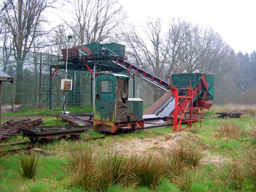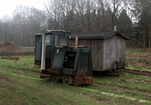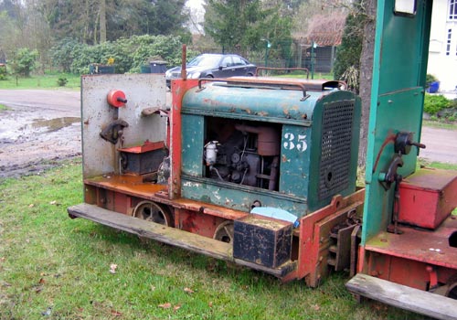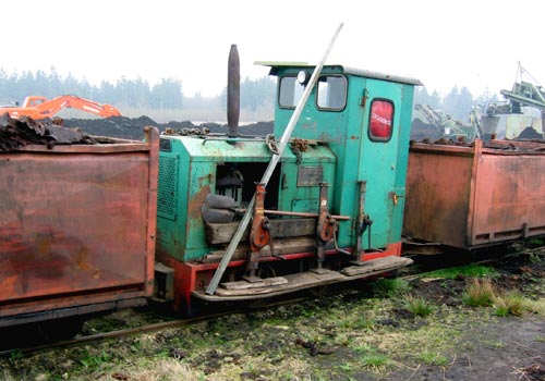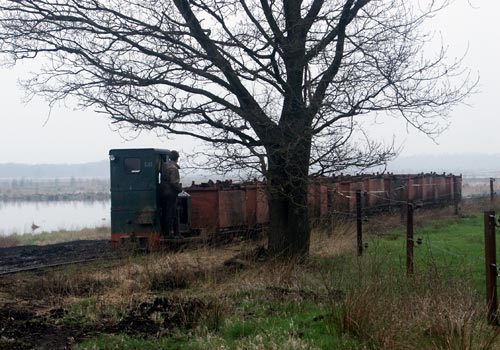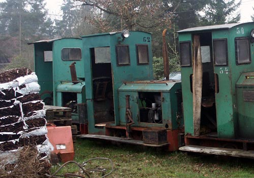 26.04.2006/ jm/ Im Werk stehen vier Loks abgestellt (35, 38, 54, 62), zwei Maschinen waren fleissig im Streckeneinsatz (53, 60), während eine dritte (53) beim Abbau im Moor als Verschublok dient. Mit Schienenfahrrädern konnte die Abbaustelle im Moor (ca. 4 km) erreicht werden, hier ist ein moderner Bagger Baujahr 2003 im Einsatz. Die Gleislage an der Abbaukante ist abenteuerlich, gelegentlich soll die Strecke samt Lok auch schon mal ins Moor abgerutscht sein. Die Lok wurde dann mit dem Bagger wieder geborgen.