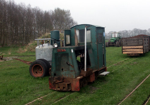 29.06.2006-info/ uv/ Die ominöse Lok 57 beim Blaubäronkel von Oesen im Teufelsmoor ist höchstwahrscheinlich Diema 2069 - der eingebaute Motor ist wohl ein Tauschmodell. Die Lok kommt somit ebenfalls von Torfwerk Turba (wo die 57 im Jahre 1992 z.B. noch vorhanden war).
