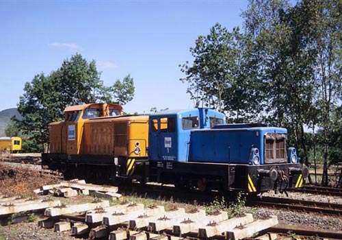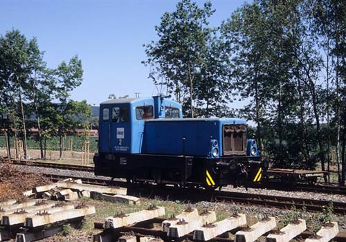 14.07.2006/rm/ Die Lok 1 steht hier an der Verladung im Einsatz. Diese Lok wurde in den Regental-Fahrzeugwerkstätten mit einem Cat-Motor ausgerüstet. Lok 2 ist als Ersatzteilspender im Lokschuppen vorhanden.