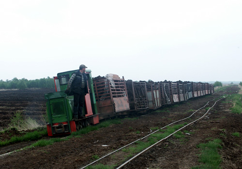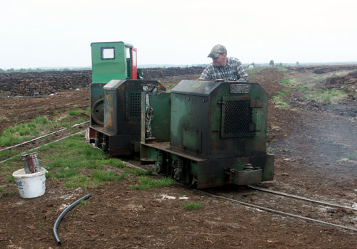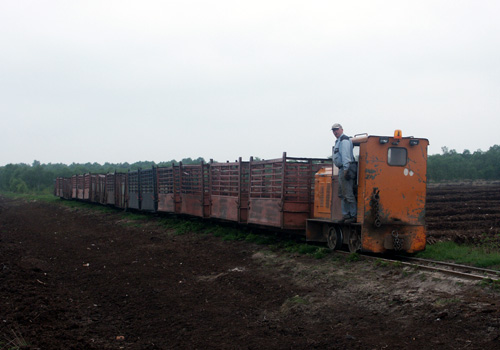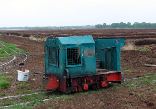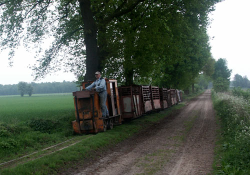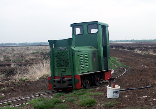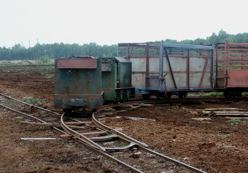 17.05.2006/ jm/ Die Strecke ins Moor ist beim Werk sehr steil, deshalb wird hier eine starke Lok (Diema 2680) eingesetzt. Diese holt die beladenen Zug im Übergabebahnhof ab und bringt diesen in zwei Teilen die Steilstrecke zum Werk hinauf. Im Werk steht derzeit eine Lok abgestellt auf dem Parkplatz (Diema 2435), eine weitere in der Werkstatt.