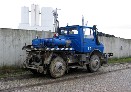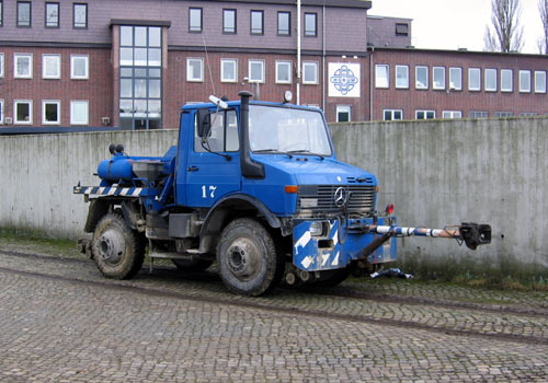 08.03.2007/ jm/ Der Zweiwege-Unimog Typ MB U 1200 mit einer Zweiwege-EInrichtung von Zweiweg-Schneider wurde heute beim Werkstor angetroffen. Das blaue Fahrzeug trägt die Nummer 17.