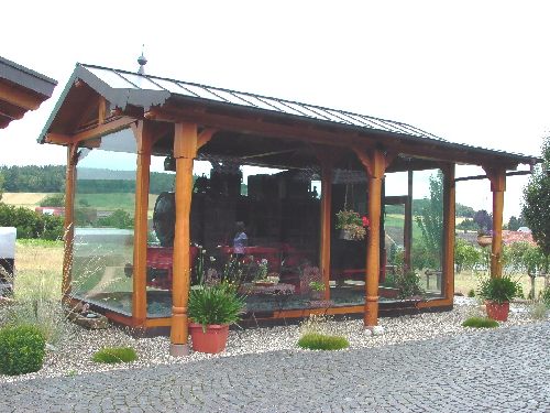 Auf dem Privatgelände befindet sich neben dem Wohnhaus ein eigenes Haus für die schmalspurige Dampflok. So eine Garage hätte ich auch gern, aber das überschreitet meine finanziellen Mittel. Die „Ausstellungshalle“ ist total verglast und die Lok kann von allen Seiten gut betrachtet werden. Der/die Eigentümer haben mir dann auch die Tür aufgeschlossen (Ich habe mich natürlich angemeldet, da es sich um Privatgelände handelt) und ich konnte die Lok besichtigen. Schilder gibt es keine. Das Kesselschild nennt „Krauss“. Die Nummer könnte „30xx“ sein. Über die Herkunft konnte nichts gesagt werden.