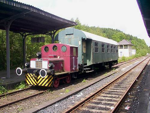 27.05.2002/ jm/ Da die Bundesbahn mittlerweile den Bahnhof auf nur noch ein betriebsfähiges Gleis zurückgebaut hat, war den Olper Eisenbahnfreunden jeglicher Einsatz ihrer Wagen genommen. Bis auf einen Umbau-Dreiachser wurden alle Wagen verkauft und abtransportiert. Übrig geblieben ist neben diesem Wagen noch die kleine Deutz-Diesellok, sie ist weiterhin rot lackiert und trägt die Phantasie-Nummer