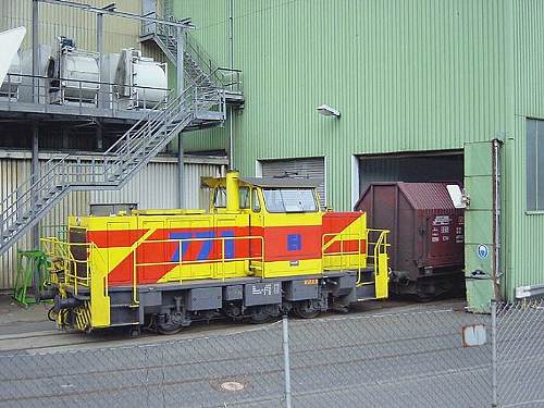 27.05.2002/ jm/ Seit Oktober 2001 wird hier, anstelle der in die Jahre gekommenen Henschel-Stangenlok, eine moderne MaK-Rangierlok der Eisenbahn und Häfen (Betr.-Nr. 771, MaK FNr. 700106/1993, Typ G 765 C) leiweise eingesetzt. Die Henschel steht abgestellt auf dem Werksgelände.