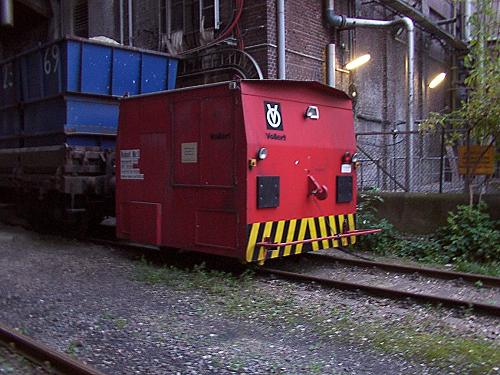 13.08.2002/ jm/ Ein kleiner Vollert-Robot schiebt hier Flachwagen mit blauen Containern für Papierabfall im automatischen Rangierbetrieb.