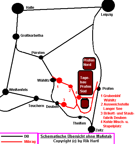 23.04.2002, 27.05.2002/ rh/ Die MIBRAG fördert heute noch in den Tagebauen Profen und Vereinigtes Schleenhain Braunkohle. Pro Jahr werden ca. 20-22 Millionen Tonnen des Rohstoffs abgebaut. Im Bereich Schleenhain wird die geförderte Kohle ausschließlich per Bandanlage in das nahegelegene Kraftwerk Lippendorf transportiert. Im Raum Profen und in Mumsdorf werden dagegen noch zwei ausgedehnte, normalspurige und elektrifizierte Grubenbahnnetze unterhalten. Seit der Einstellung des Werkbahnnetzes im Leipziger Südraum besteht keine Verbindung mehr zwischen den beiden Betrieben.